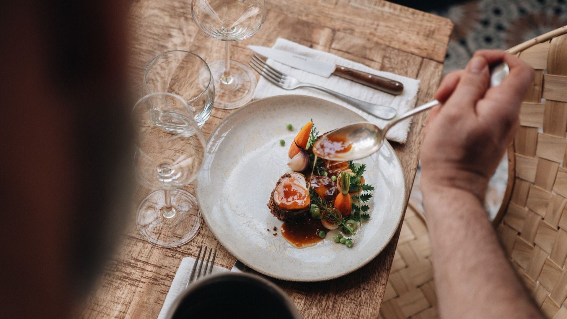 The Bandiat runs through the granite chaos. Its song mingles with that of the birds. What sweet music! The glass roof puts our heads in the trees. Time for lunch. Grégoire cooks the land, the land of his native Périgord, a cuisine firmly rooted in tradition, at once intuitive and gourmet, creative and endearing. It's a cuisine that captures the ephemeral, a moment in time, an emotion. The produce we use is in season, and feeds the local circle of a virtuous economy. Local producers become partners, sharing the same culture of ‘well done’ and good farming sense. Herbs, wild flowers and mushrooms abound in this country estate and woodland. They are the hallmark of the Parc Naturel Régional Périgord Limousin, the signature of the chef's dishes. An osmosis between the chef and nature at his fingertips. At our table, all the local produce is invited: knives from Nontron, chestnut chairs, ceramic crockery. Following the same credo, our wine selection gives pride of place to south-western wines produced according to the precepts of biodynamics. All the skills of our craftsmen, producers and winemakers come together in symbiosis on the table, adding meaning and congruence to this moment of gastronomy. BANDIAT is a restaurant where sitting down is an act of conviction.