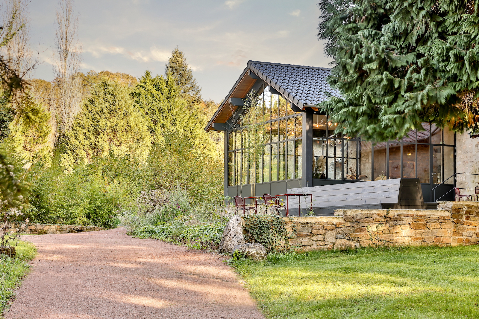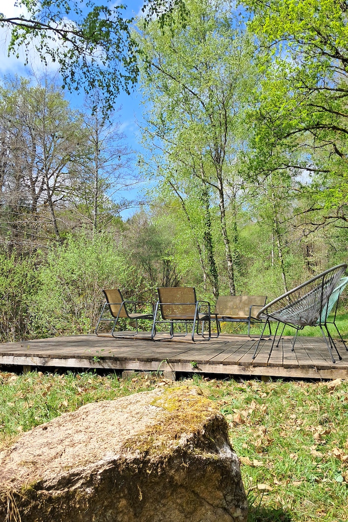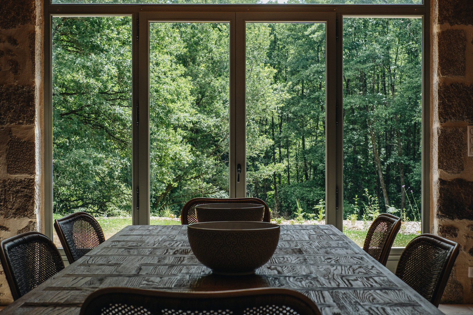 En empruntant le chemin des bois et en traversant la rivière vous rejoignez le restaurant du Domaine Bandiat, la piscine, la salle de massage, la salle zen...